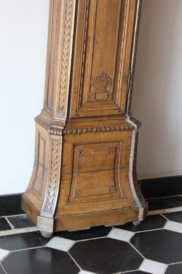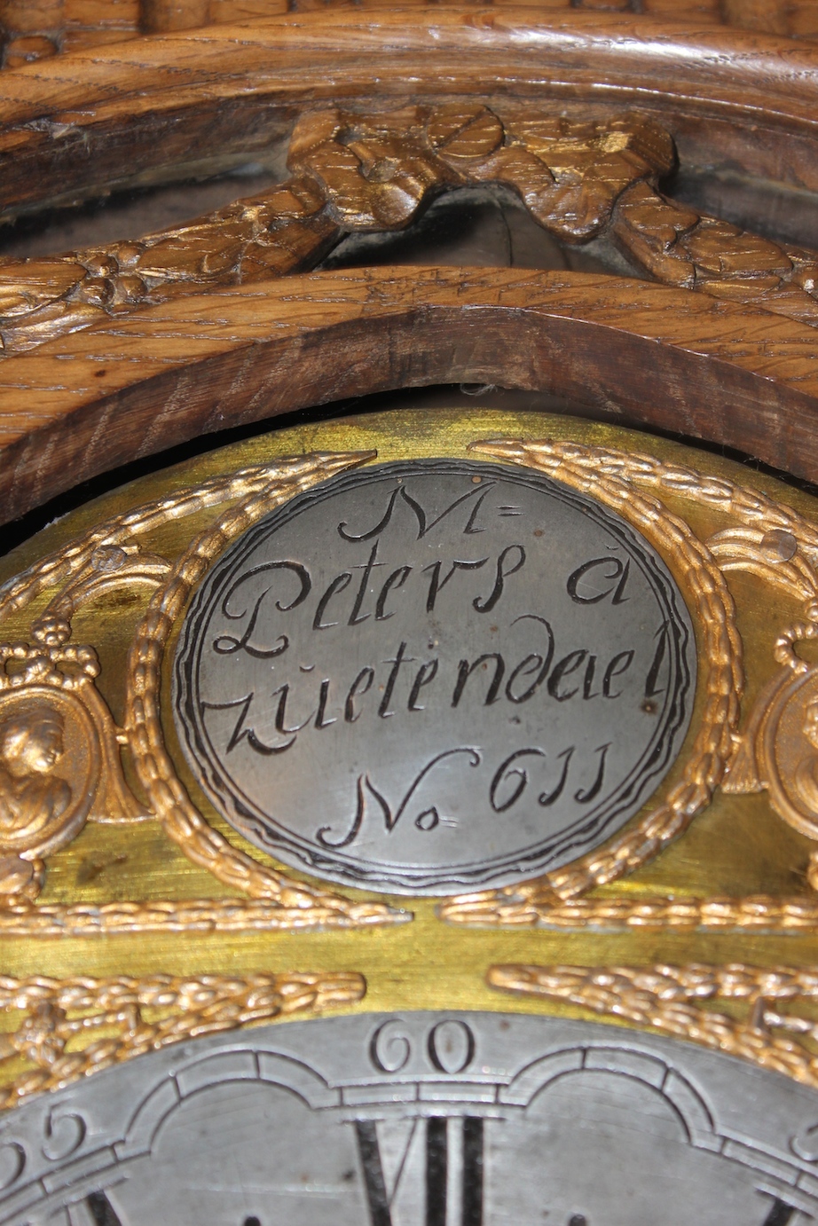 Zeer mooie gesculpteerde eiken staande klok , gesigneerd : M.Peeters à Zutendael 611. Binnenkant slingerdeur staat bovenaan I.A.E. fecet . Op het bovendeel , hoed, van de kop staan de letters : I.F.K. gesculpteerd .