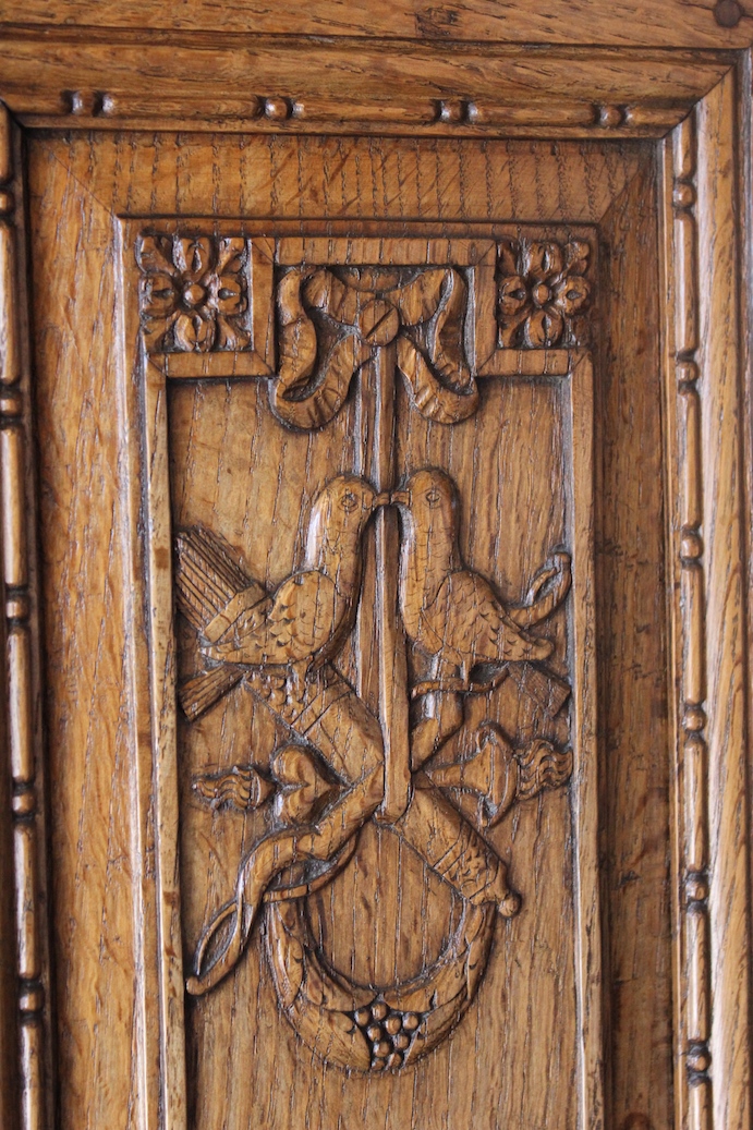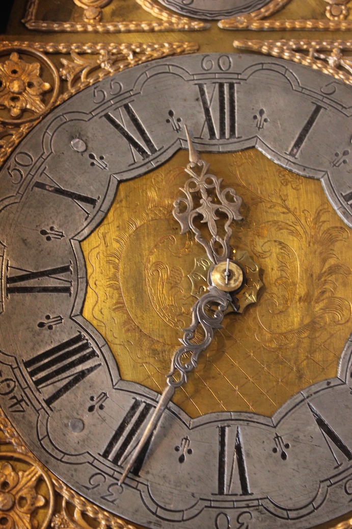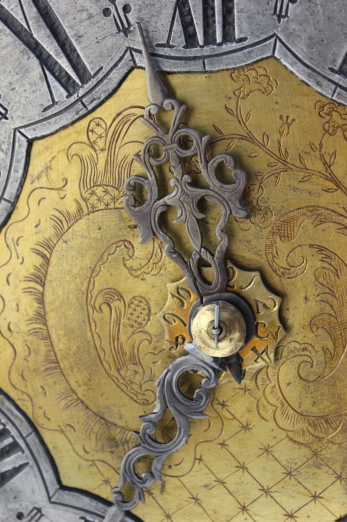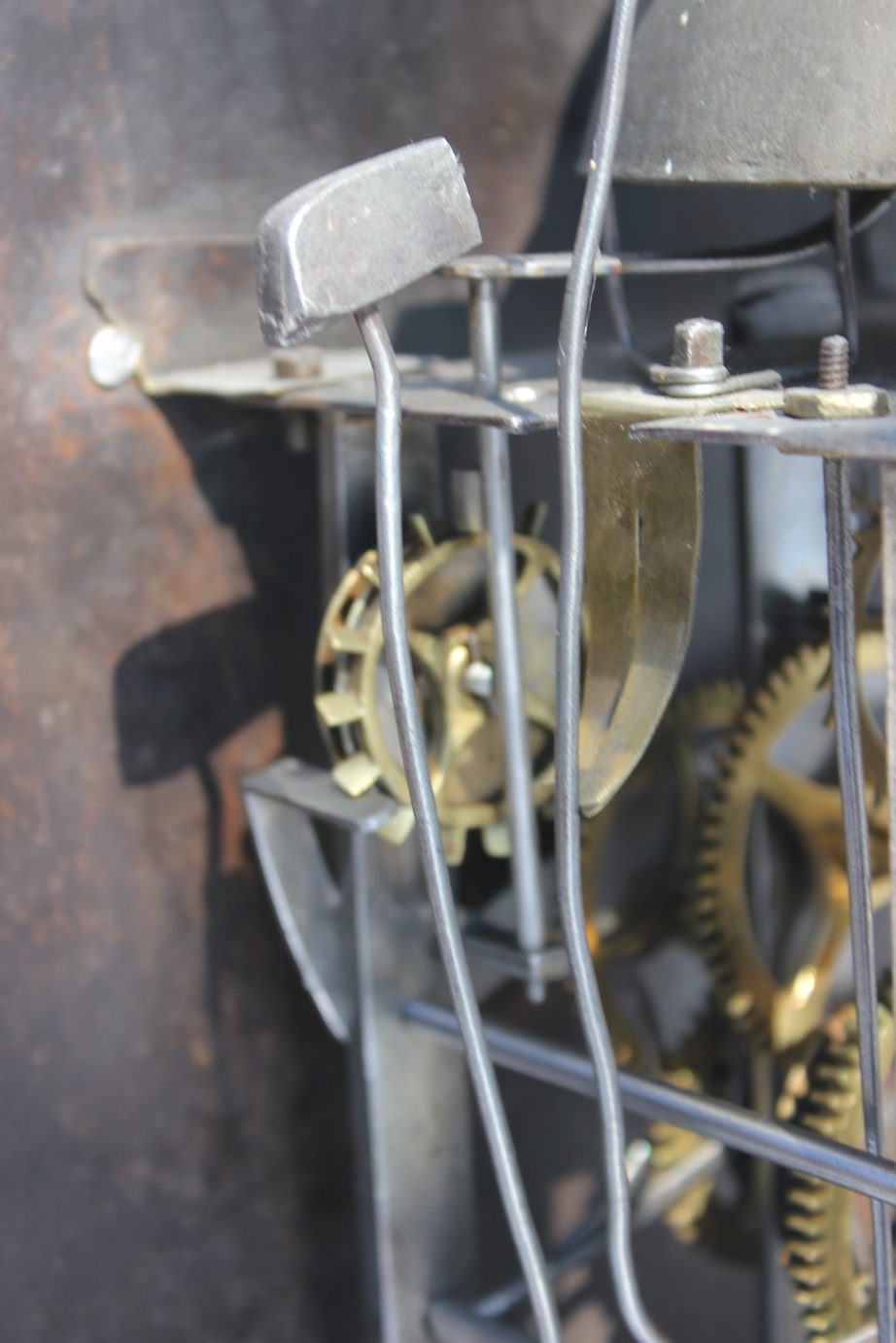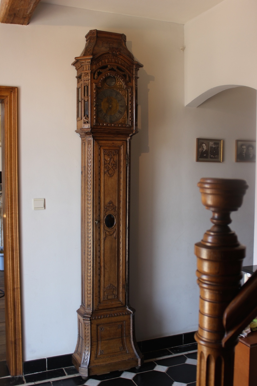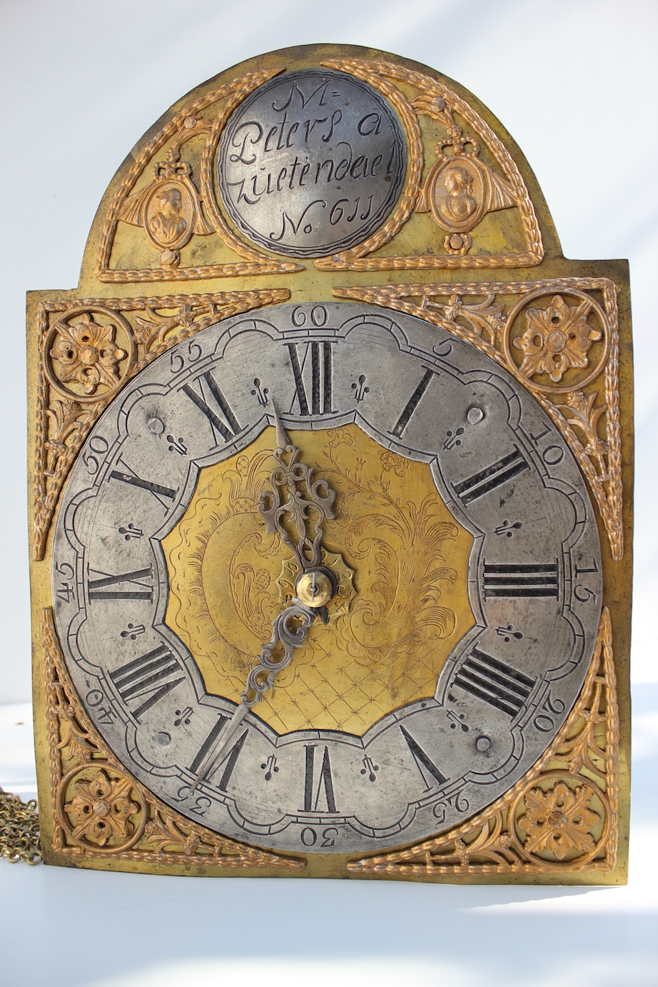 Zeer mooie gesculpteerde eiken staande klok , gesigneerd : M.Peeters à Zutendael 611. Binnenkant slingerdeur staat bovenaan I.A.E. fecet . Op het bovendeel , hoed, van de kop staan de letters : I.F.K. gesculpteerd .