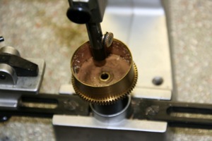 Op de draaibank leg ik het gat van de veertrommel weer terug in het midden en ruim ik het gat opnieuw.
